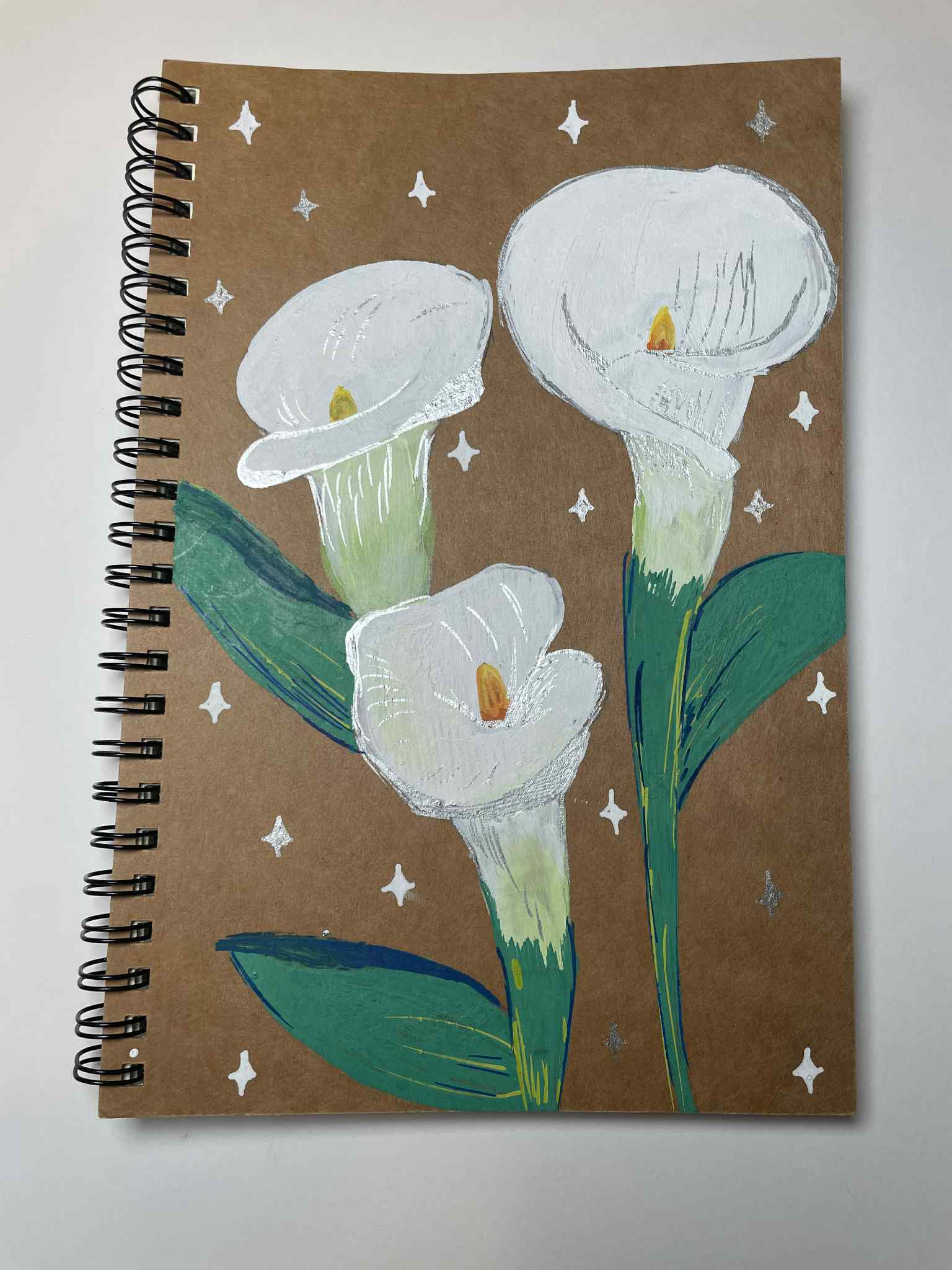Hand-painted with acrylic markers. The journal itself is a blank sketchbook. It is an A5 / 8.3"X5.5" dimension. Contains 100 pages/50 sheets.